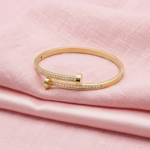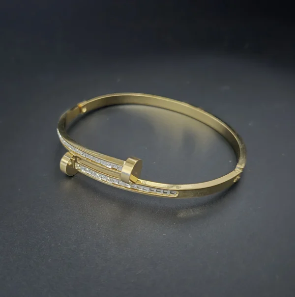 Redefine your jewelry collection with our Nail Bangle, a piece that blends bold, industrial-inspired design with high-end sophistication. Featuring a sleek, mirrored 18K gold finish and a delicate row of hand-set crystals along the “nail” head and shank, this bracelet is designed to be a standout solo piece or the foundation of a luxurious wrist stack.