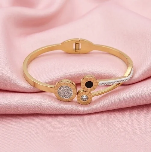 Elevate your jewelry curation with this sophisticated Roman Numeral Bangle. Blending classical motifs with contemporary flair, this piece features interlocking circular charms detailed with crisp Roman numerals and brilliant crystal pavé accents. The striking contrast of black and white enamel elements against the radiant 18K gold finish makes it a versatile statement piece for both professional attire and evening wear.