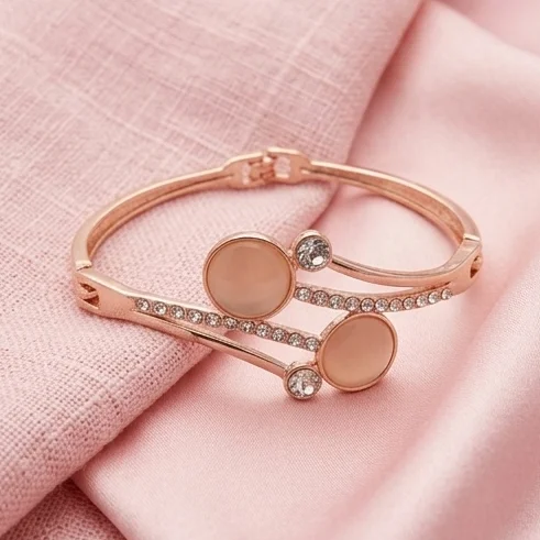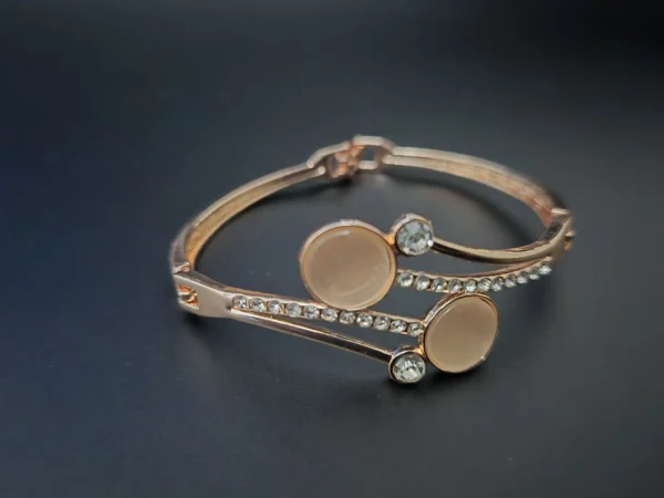 Detailed with a dual-disc cat-eye centerpiece and shimmering crystal bypass bands. This premium bracelet blends modern geometry with a luxurious finish.