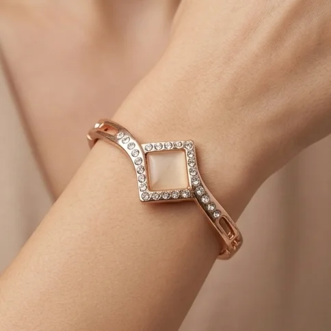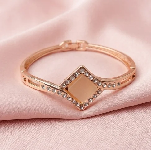 Features a central square cat-eye stone framed by a crystal-studded rhombus. This premium bracelet offers a bold, geometric aesthetic for 24/7 modern luxury.