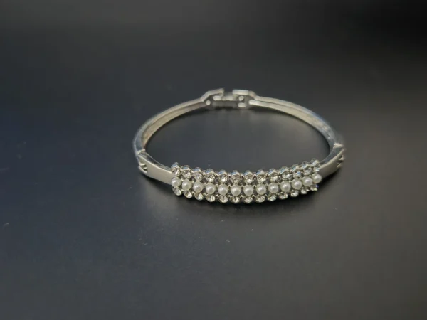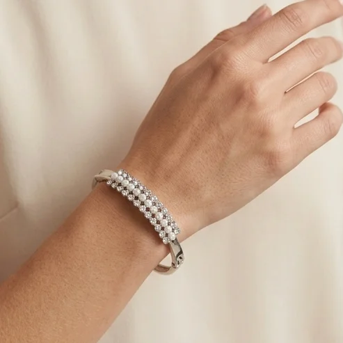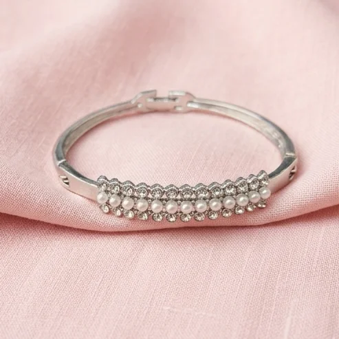 Detailed with a dual row of shimmering crystals and central white pearls, this premium silver-plated bracelet offers a luxurious, modern glow for any occasion.