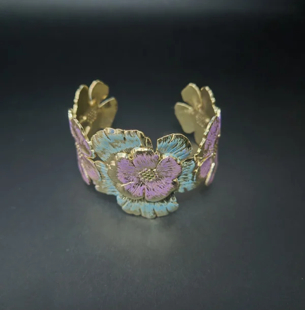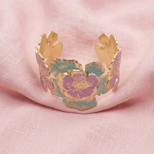 Detailed with etched multi-tonal pastel blue and purple flowers. This 100% waterproof and never-tarnish cuff brings vibrant botanical luxury to your daily wear.