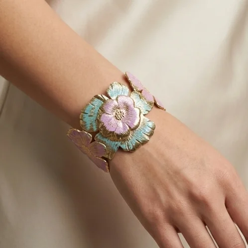 Precision meets comfort in this bold botanical design. The bracelet features a reinforced semi-flexible core that allows for a secure, custom-feeling fit on any wrist. The architectural “set and forget” open-back mechanism provides the structural integrity needed to keep the heavy-gauge floral band safely in place while offering effortless one-handed application.