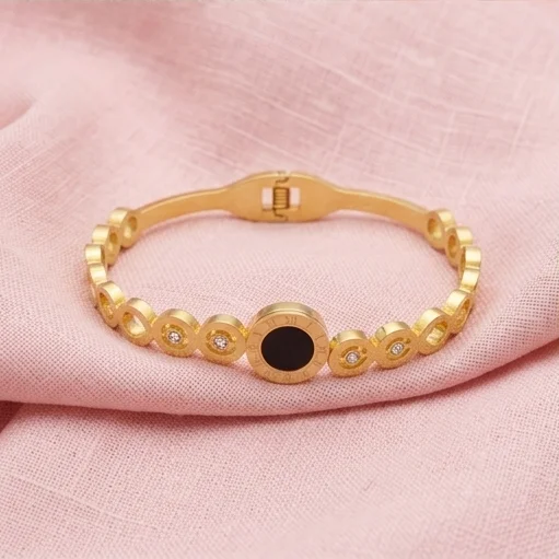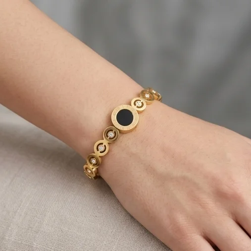 Elevate your accessory collection with a piece that balances classical motifs and contemporary durability. Featuring a central black onyx-style medallion bordered by crisp Roman numerals, this bracelet is accented with shimmering crystal-set circular links. The radiant 18K gold finish provides a warm, sophisticated glow that complements any skin tone.