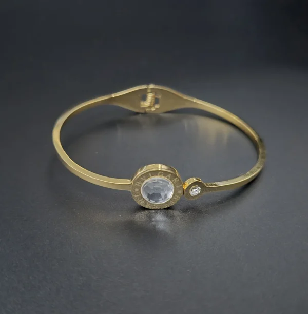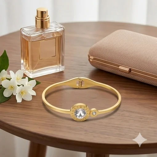 Features a central disk with a large brilliant crystal and a side accent. 100% waterproof and never-tarnish quality—luxury for 24/7 daily wear.