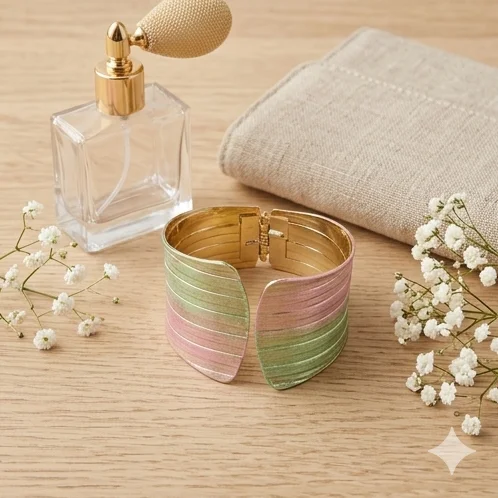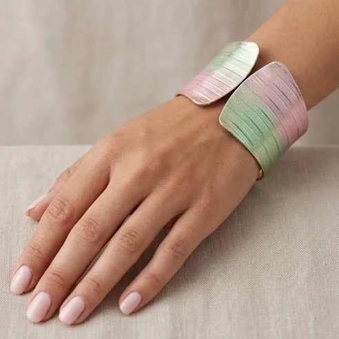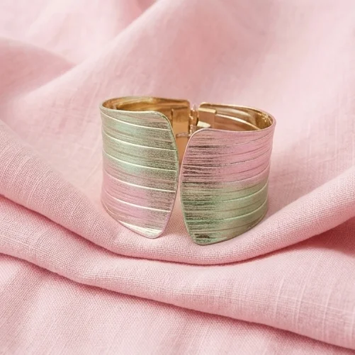 The Sunset Horizon Bracelet is a high-fashion cuff designed to stand out. Featuring a wide, ribbed texture, this bracelet is finished with a unique metallic gradient of soft pink and seafoam green over a brilliant 18K gold base, mimicking the colors of a tropical horizon.
