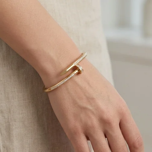 High-Octane Sparkle & Sleek Design The Crystal Nail Bracelet is the ultimate expression of modern glamour. Featuring a wrap-around nail silhouette adorned with a continuous row of shimmering crystals, this piece captures the light from every angle. Its polished 18K gold finish adds a touch of warmth and opulence, making it a must-have for any fashion-forward jewelry collection.